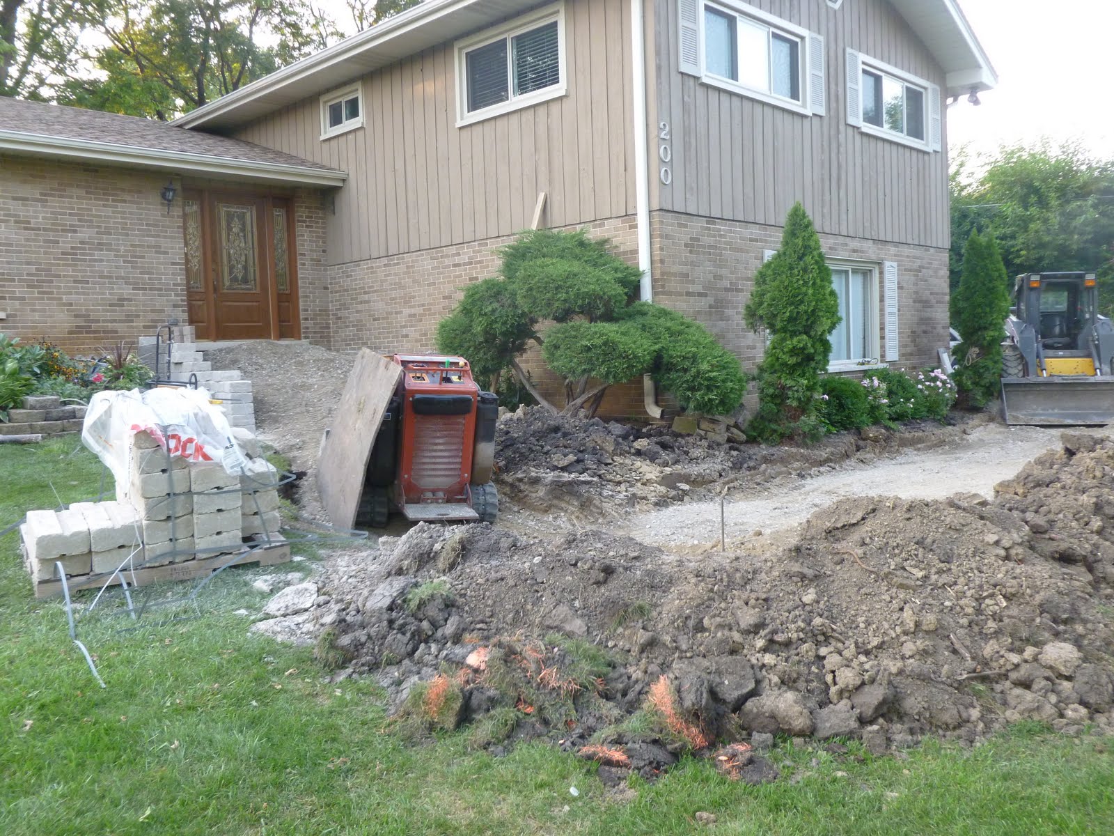 Well, I'm home and the finished project looks great. Snapped a couple of pictures just as it started to sprinkle. O'Donovans really exceeded my expectations. I expected to see a finished walkway and a lot of dirt and dug up plants to fuss with. They brought in sod and re-planted all my plants -- perhaps not exactly as I would have arranged them, but at least I don't have to do anything with them this fall. I've hated our front porch for years, and most of our company just came in through the garage rather than try to negotiate our front steps. I've locked the garage door and want everyone to use and enjoy my beautiful (and safe) front entrance. Come see us!